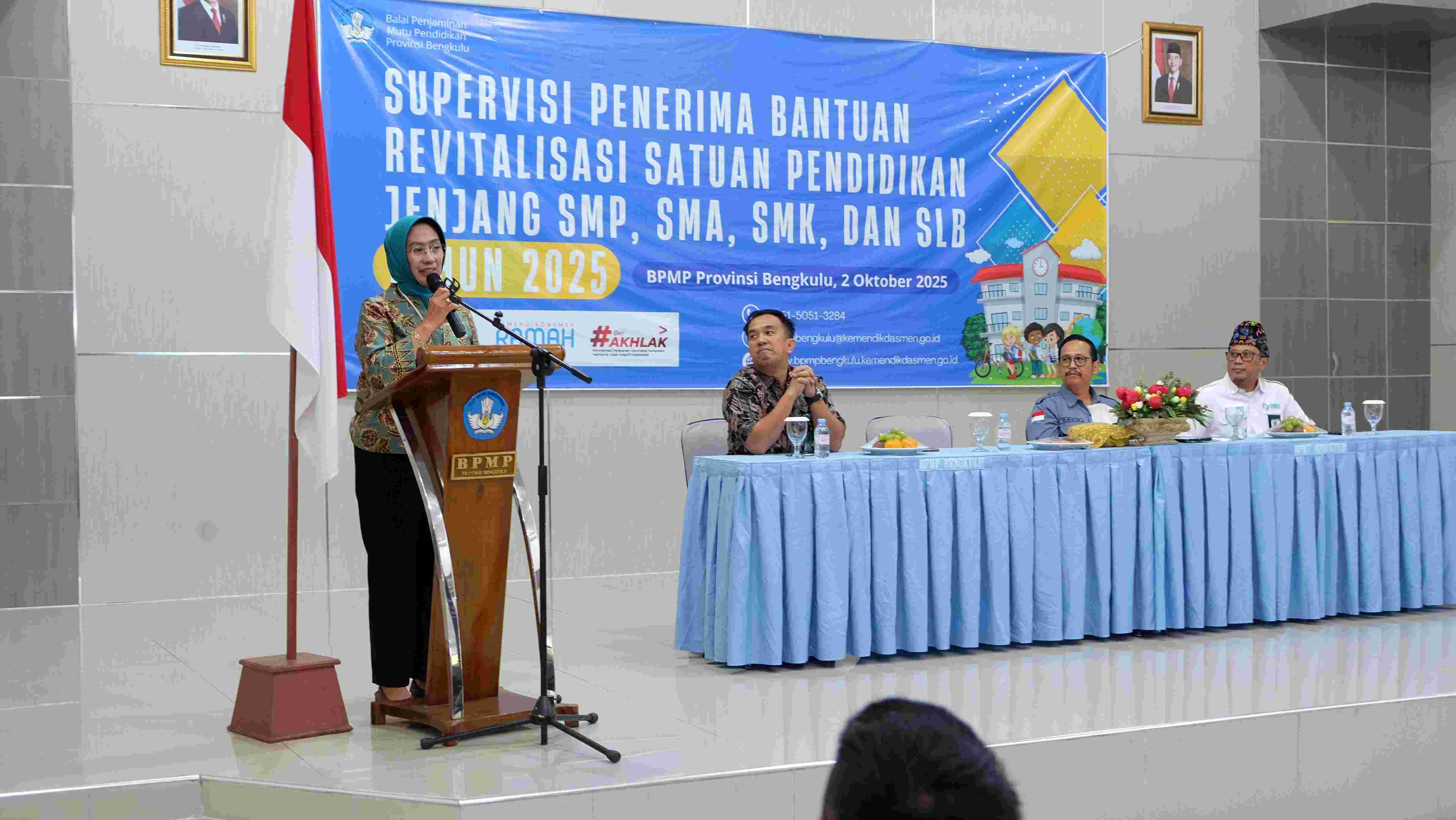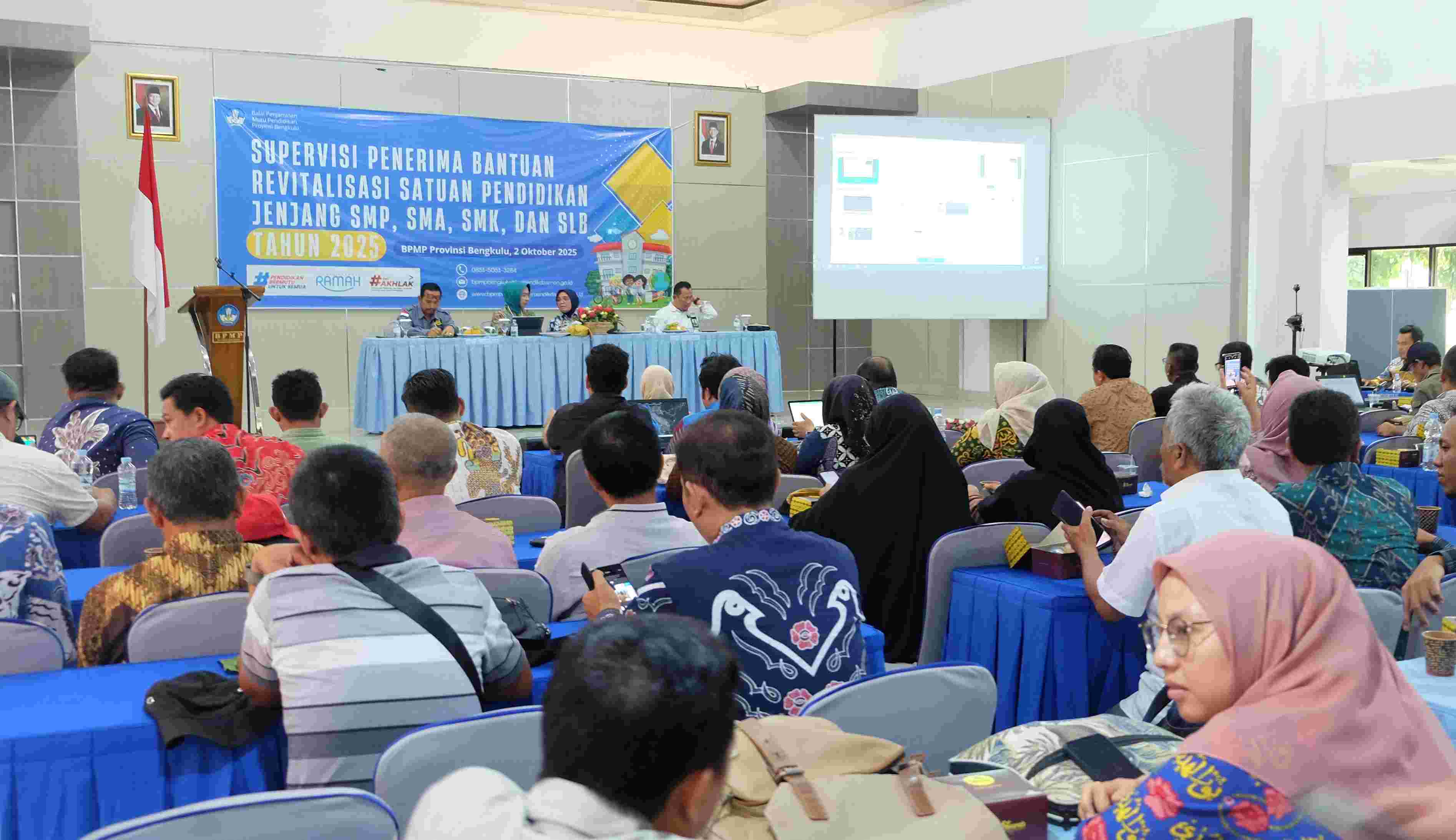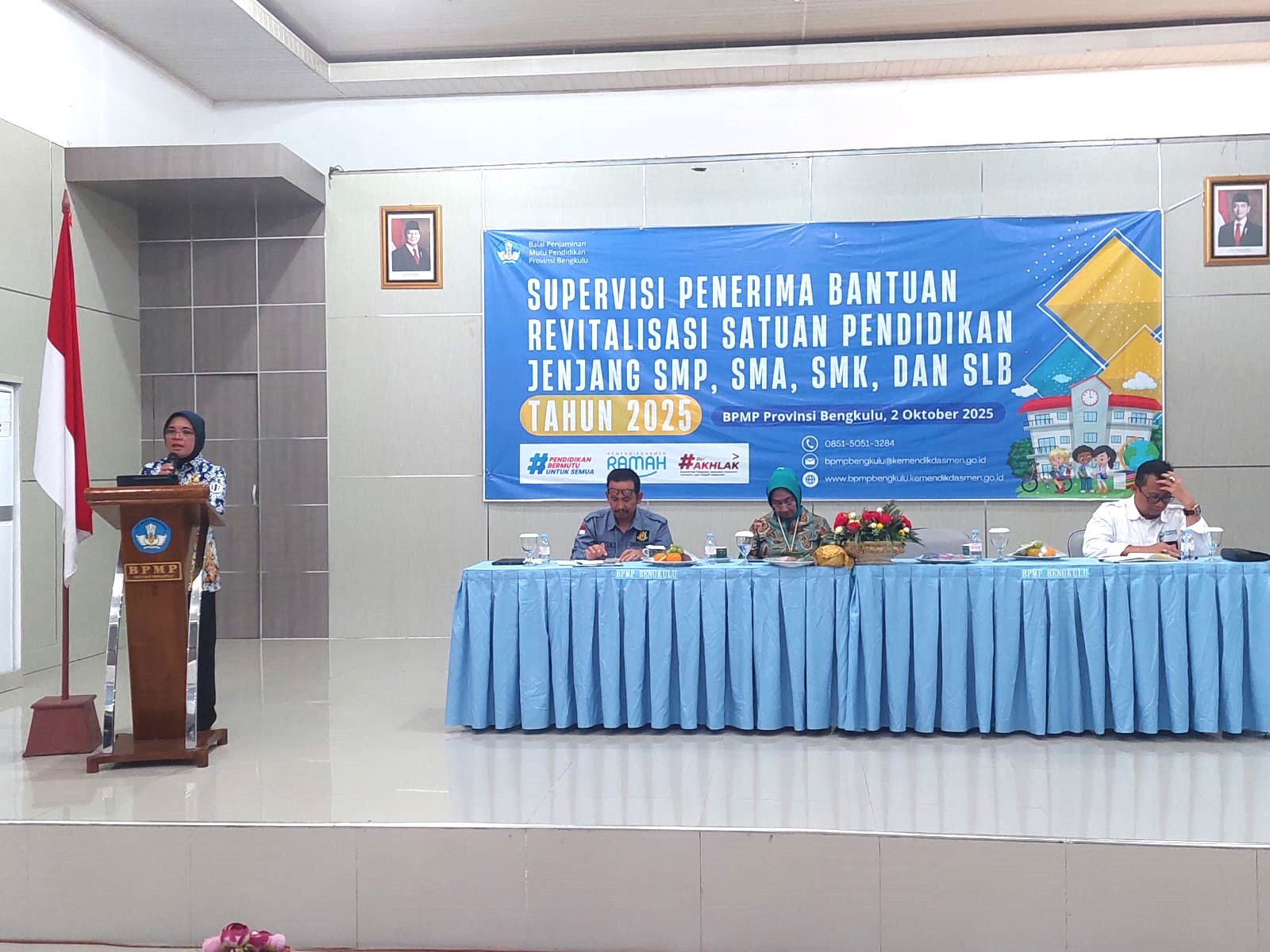 BENGKULU, bpmpbengkulu.kemendikdasmen.go.id – Balai Penjaminan Mutu Pendidikan (BPMP) Provinsi Bengkulu menggelar kegiatan Supervisi Program Prioritas Revitalisasi Satuan Pendidikan untuk jenjang SMA, SMK, dan SLB., Kamis (2/10). Acara yang berlangsung di Aula Bencoolen BPMP Provinsi Bengkulu ini menghadirkan para pemangku kepentingan, mulai dari Kepala Dinas Pendidikan dan Kebudayaan Provinsi Bengkulu, kepala sekolah penerima program revitalisasi, konsultan pengawas dan perencana, fasilitator Universitas Bengkulu, hingga aparat penegak hukum.